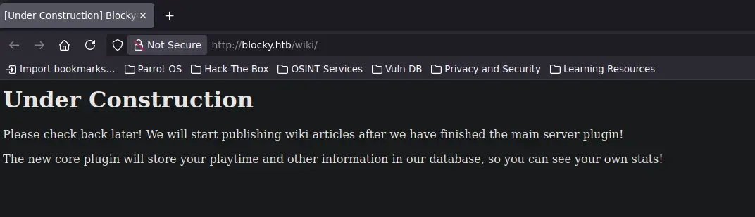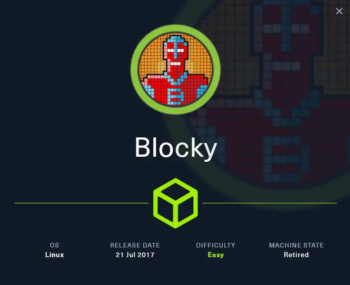 http://blocky.htb [200 OK] Apache[2.4.18], Country[RESERVED][ZZ], HTML5, HTTPServer[Ubuntu Linux][Apache/2.4.18 (Ubuntu)], IP[10.129.107.255], JQuery[1.12.4], MetaGenerator[WordPress 4.8], PoweredBy[WordPress,WordPress,], Script[text/javascript], Title[BlockyCraft – Under Construction!], UncommonHeaders[link], WordPress[4.8]