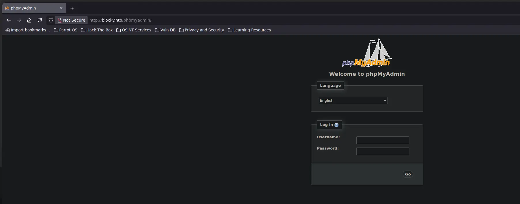 > =============================================================== Gobuster v3.6 by OJ Reeves (@TheColonial) & Christian Mehlmauer (@firefart) =============================================================== [+] Url: http://blocky.htb [+] Method: GET [+] Threads: 100 [+] Wordlist: /usr/share/seclist/Discovery/Web-Content/directory-list-2.3-medium.txt [+] Negative Status codes: 404 [+] User Agent: gobuster/3.6 [+] Timeout: 10s =============================================================== Starting gobuster in directory enumeration mode =============================================================== /wiki (Status: 301) [Size: 307] [--> http://blocky.htb/wiki/] /wp-content (Status: 301) [Size: 313] [--> http://blocky.htb/wp-content/] /plugins (Status: 301) [Size: 310] [--> http://blocky.htb/plugins/] /wp-includes (Status: 301) [Size: 314] [--> http://blocky.htb/wp-includes/] /javascript (Status: 301) [Size: 313] [--> http://blocky.htb/javascript/] /wp-admin (Status: 301) [Size: 311] [--> http://blocky.htb/wp-admin/] /phpmyadmin (Status: 301) [Size: 313] [--> http://blocky.htb/phpmyadmin/] /server-status (Status: 403) [Size: 298] Progress: 220545 / 220546 (100.00%) =============================================================== Finished