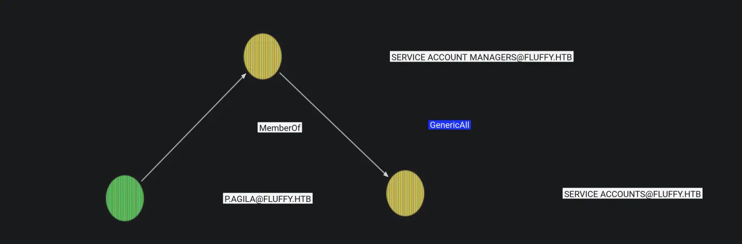 The Service Account Managers group, to which the p.agila belongs, has GenericAll, i.e. Full Control over the Service Accounts group, which means that we could add ourselves or another user account to the latter