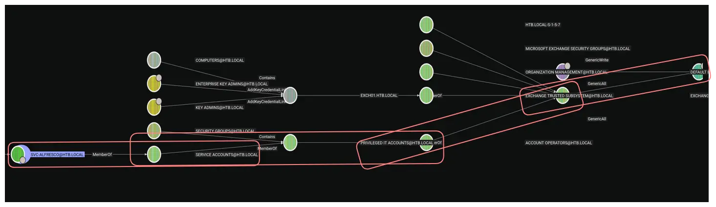 SVC-Alfresco (User) → Service Accounts (Group) → Privileged IT Accounts (Group) → Account Operators (Group) → Exchange Windows Permissions (Group) → HTB.local (Domain)