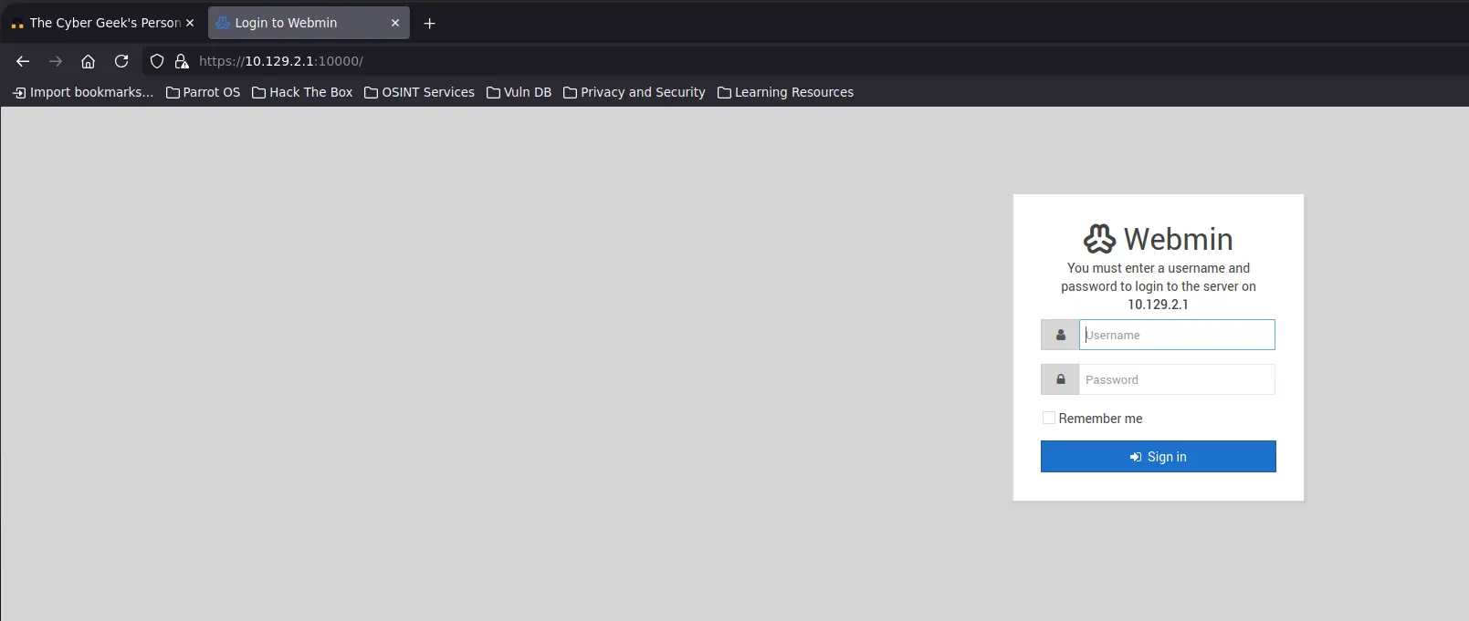 Once we accept the risk and continue, we find a Webmin Panel prompting for authentication
