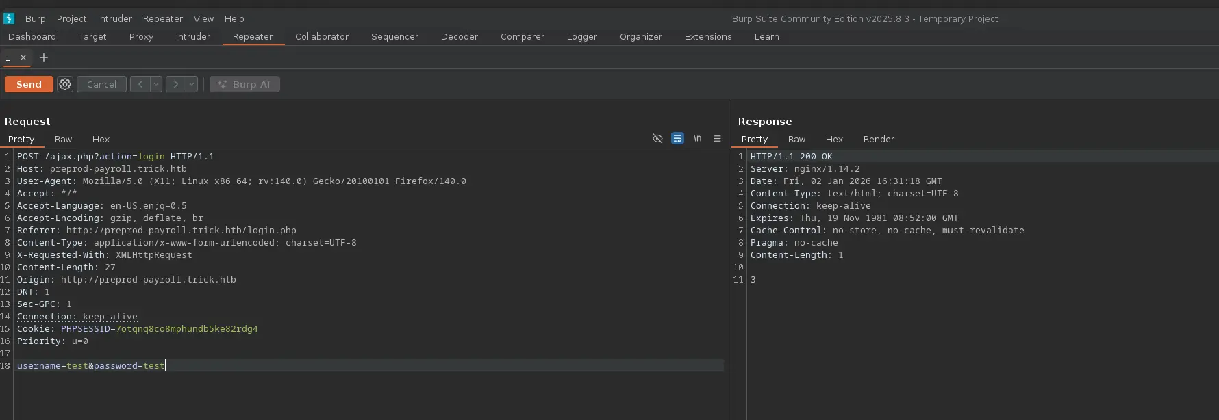To do so, we will log out and start burpsuite in order to intercept the HTTP request, and send it to the Repeater. This way we can test the login with different payloads