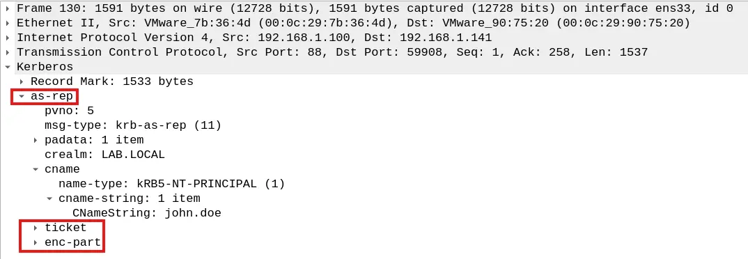 Remember that the encrypted-part is encrypted with a key derived from the password of the given principal (clientName). Therefore, an operator could parse this data and convert it to a hashcat format in order to try crack this hash and obtain the plain password of the kerberos principal