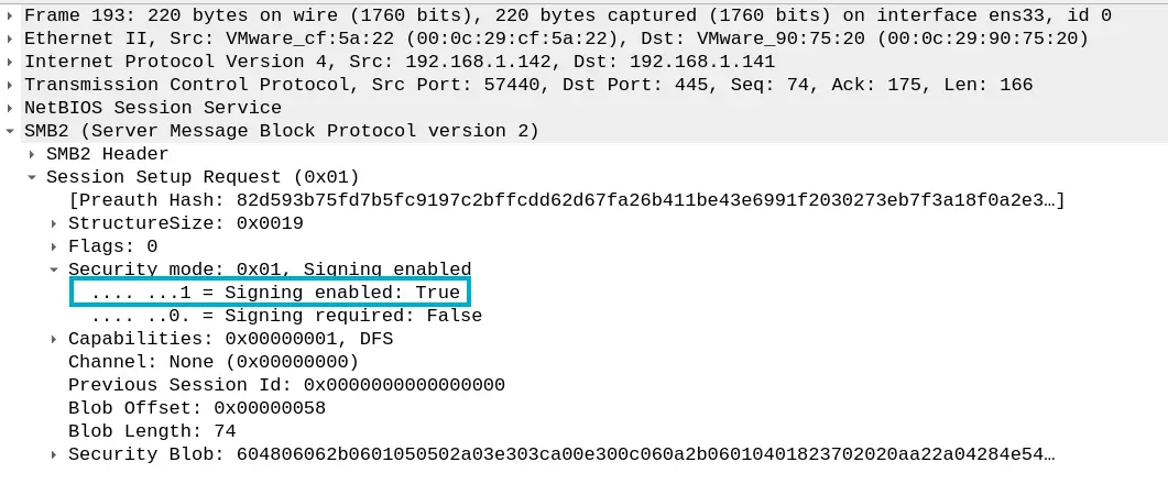 Therefore, it is not possible to cross-relay a coerced authentication over SMB to the DC’s LDAP Server as the SMB client support/enables session signing and the LDAP server allows session signing if the client requests it, which is the case