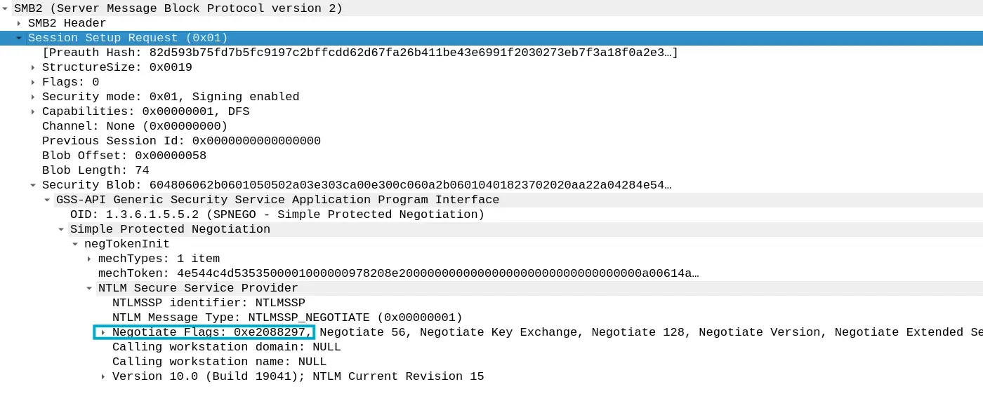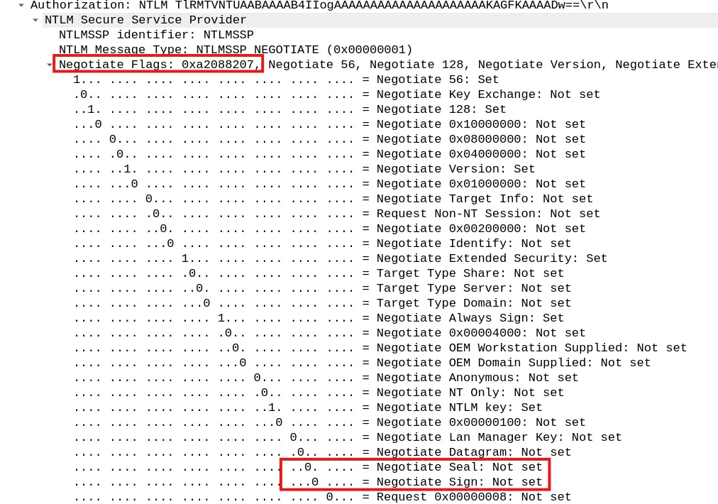 Above all, here, the problematic part is the NTLMSSP_NEGOTIATE_SIGN flag. If a destination server is set to allow session integrity if the client requests it, all session messages will be signed with a key derived from the password of the account we are trying to impersonate
