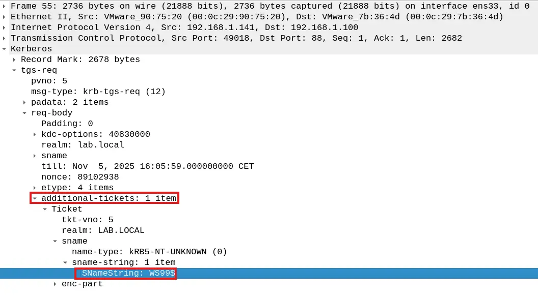 This additional ticket is the service ticket we received within the TGS_REP during the S4U2Self process. As can be seen in the image below, the SName field of this ticket is related to the controlled computer account