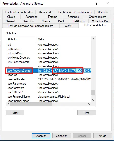 Get-DomainUser -UACFilter 'PASSWD_NOTREQD' -LDAPFilter '(!(UserAccountControl:1.2.840.113556.1.4.803:=2))' | Select samAccountName, userAccountControl | fl